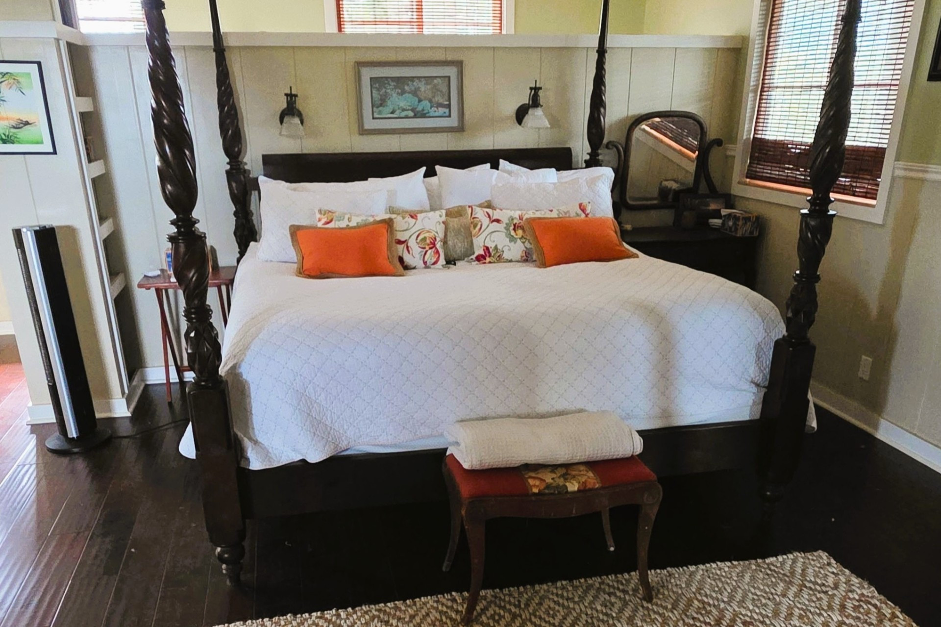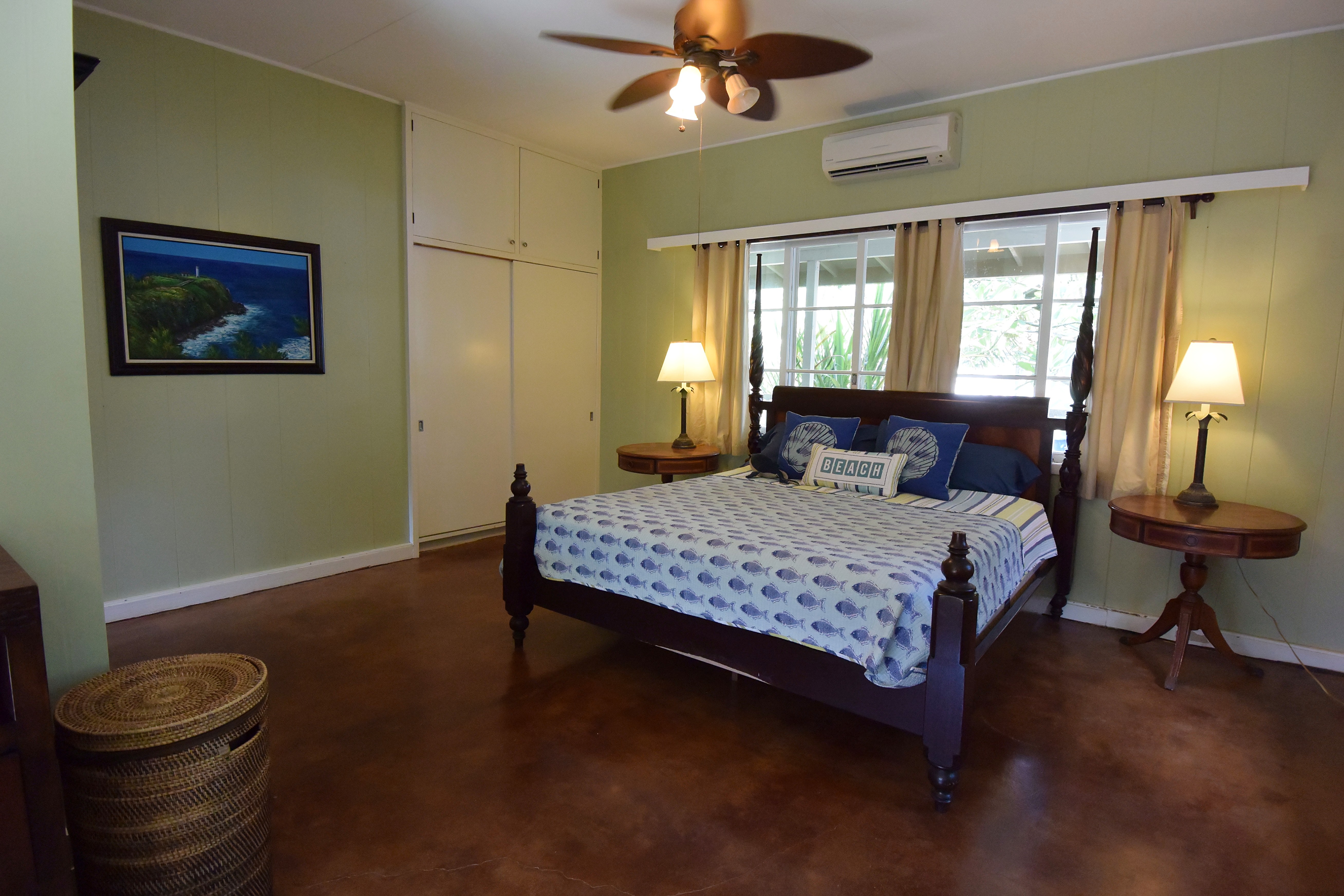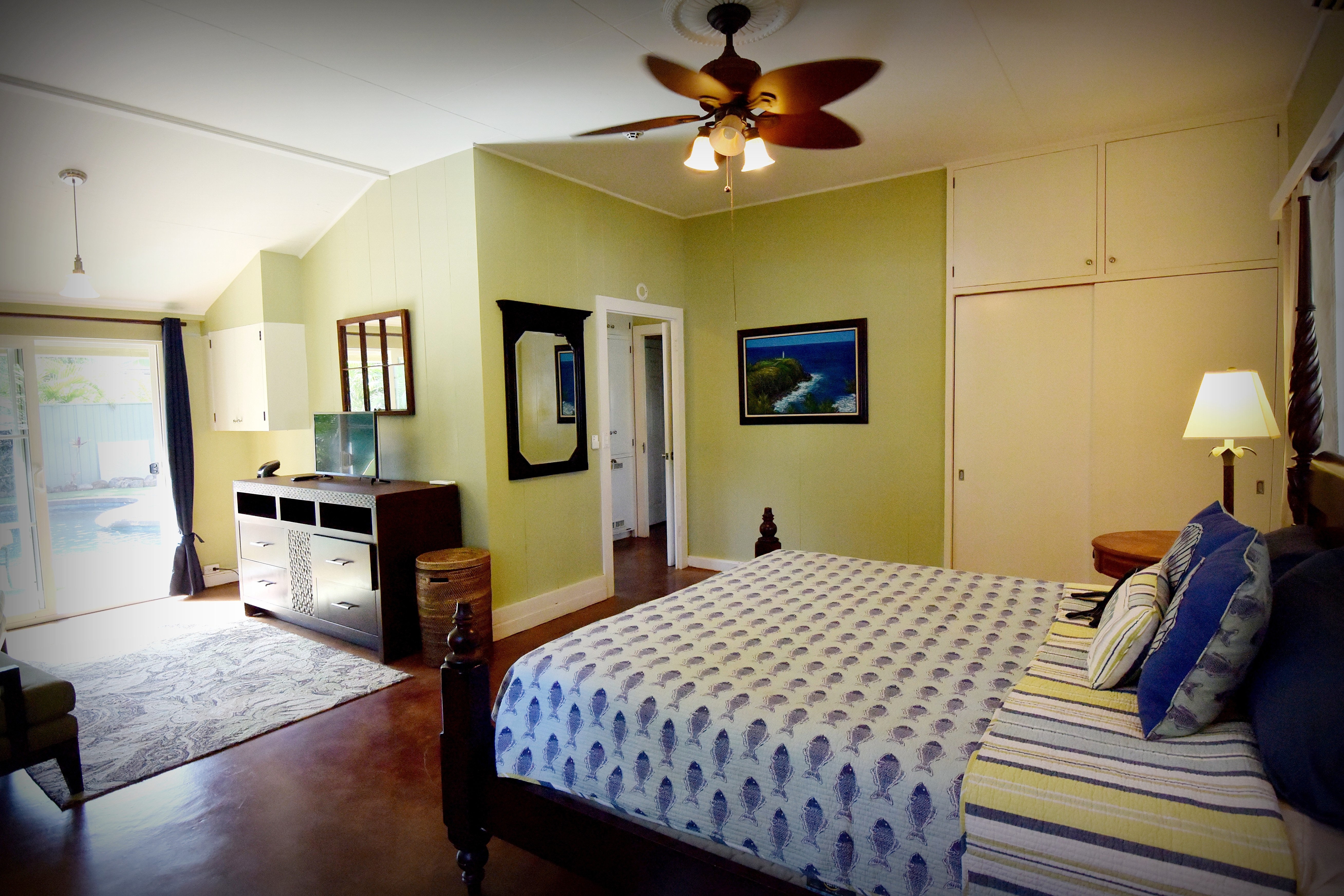 Kauai Suite - This spacious main floor bedroom includes a king (or split twin) setup, private sitting area, large closet, vanity, and A/C. Shared bath with Pool Suite.